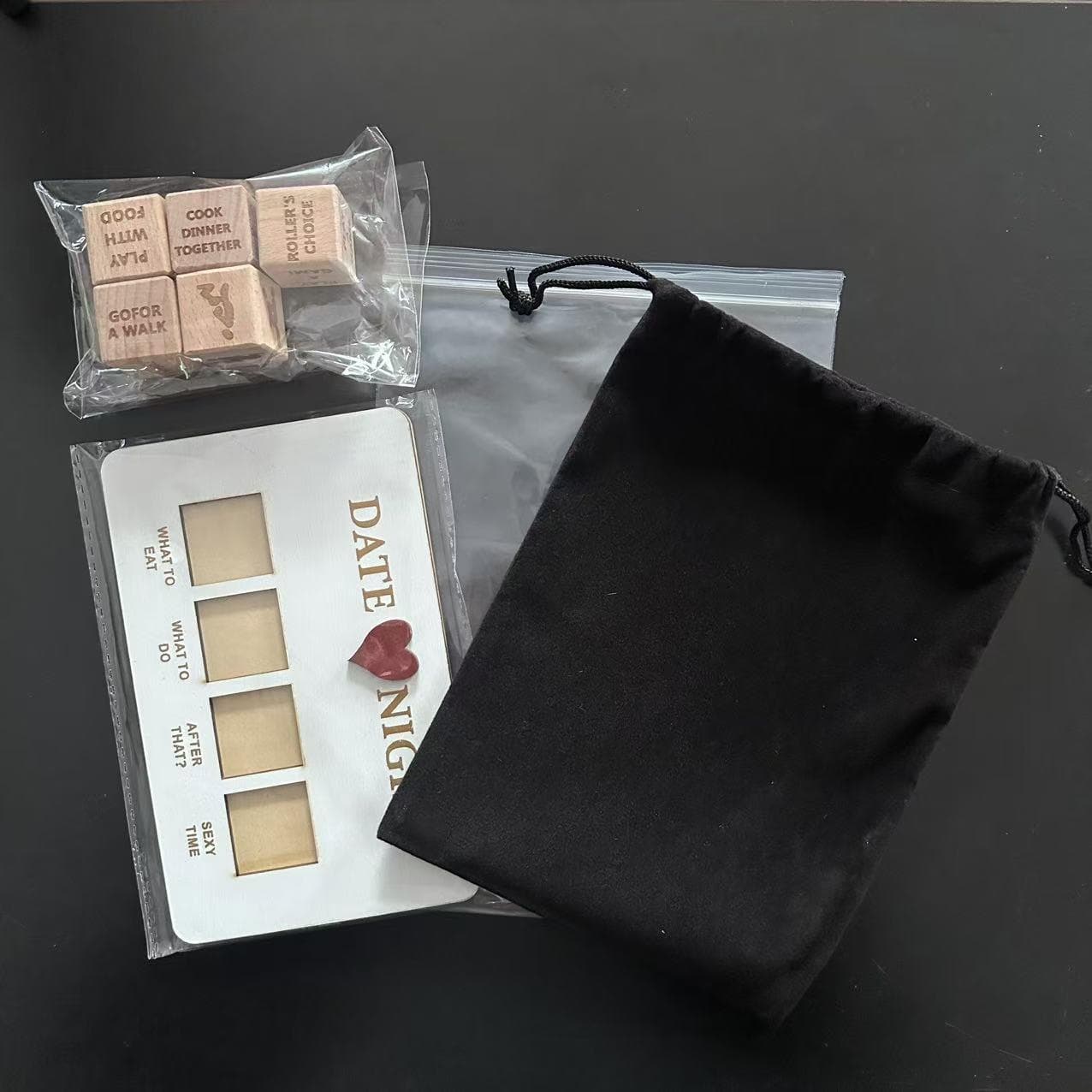 The set includes:1 chessboard, 5 wooden dice and a black velvet bag and a lucky head and tail coin. Surprise your date.