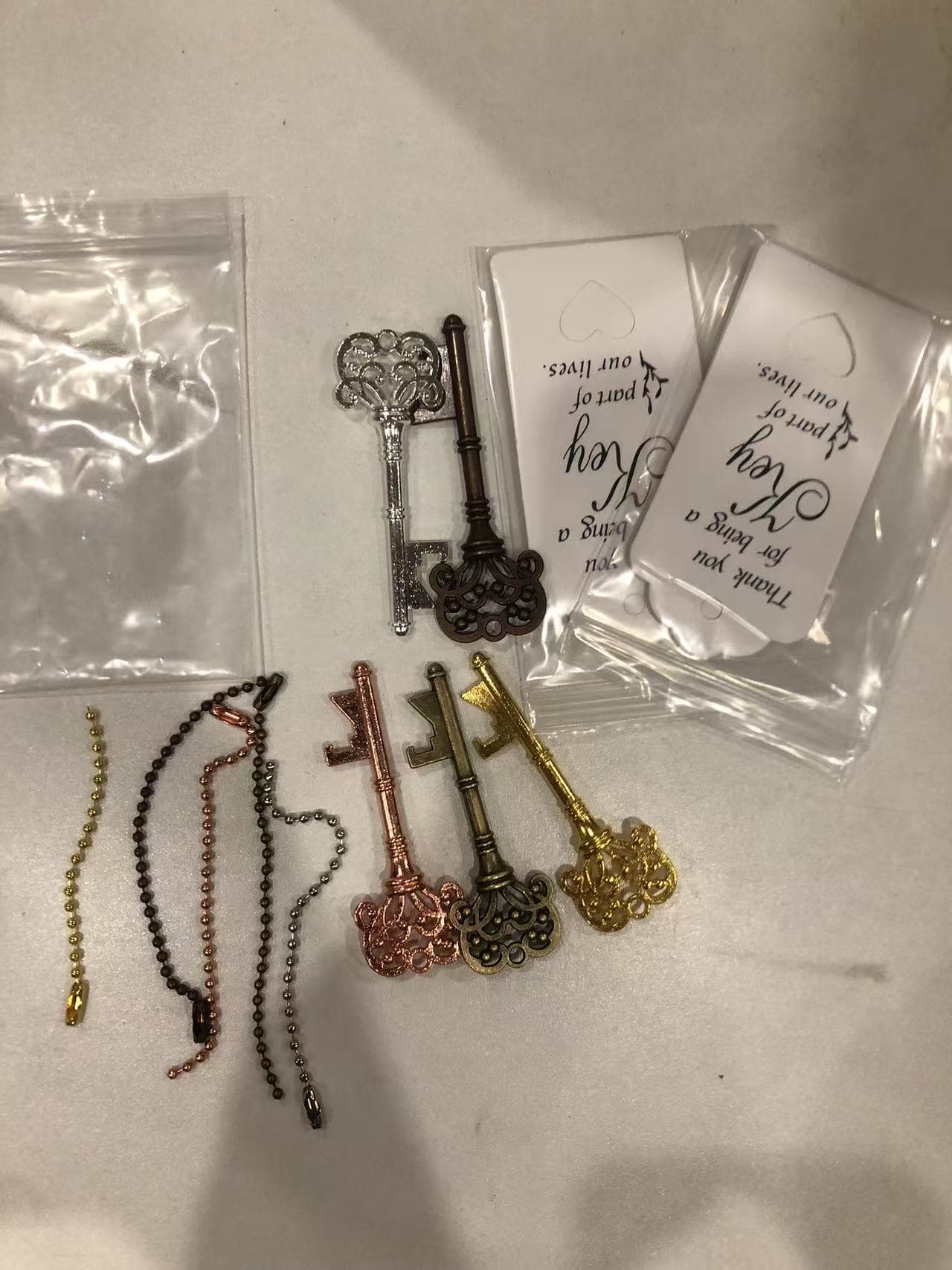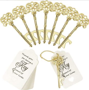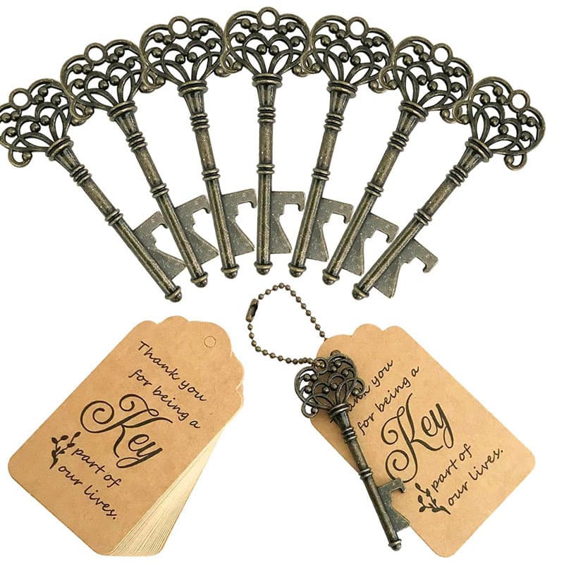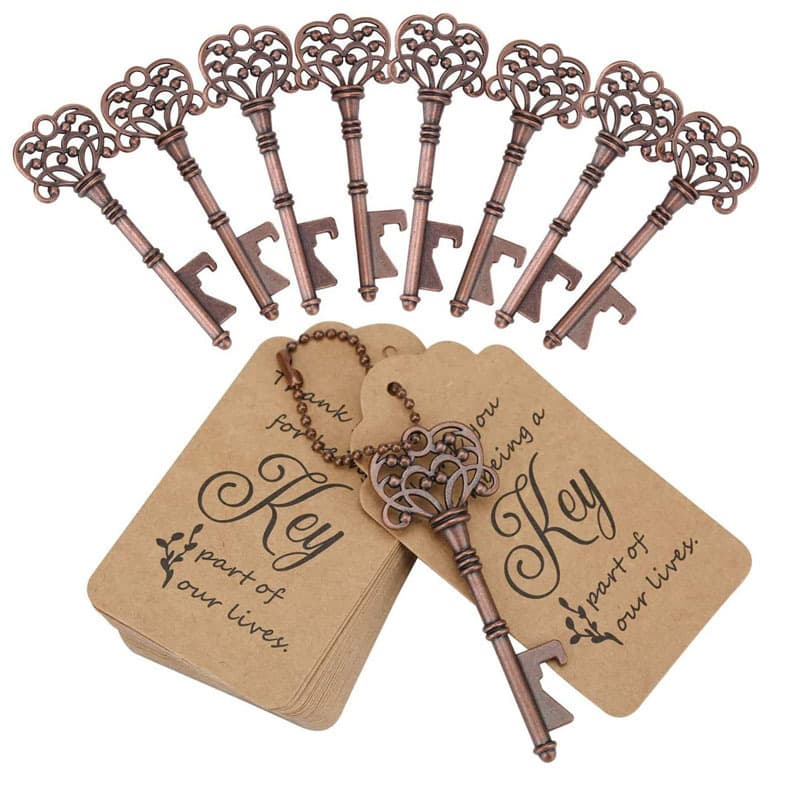 Three-Piece Set wedding gift bottle openers mixed in 5 colors, retro skeleton key bottle openers, key bottle openers with guard tags, gift cards and key chains for guests' wedding gifts (one each in 5 colors)